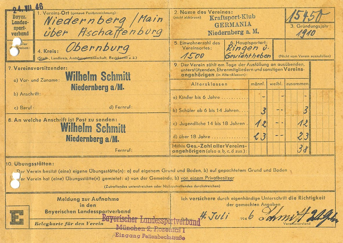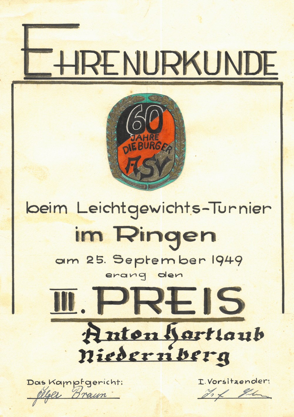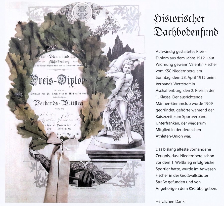 Das älteste Zeugnis, dass Niedernberg bereits vor dem 1. Weltkrieg erfolgreiche Sportler in seinen Vereinen hatte. Dieses Preis-Diplom erhielt Valentin Fischer im Jahre 1912.